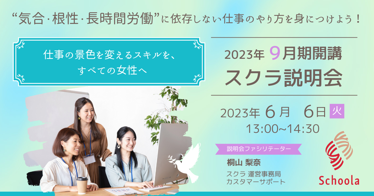 【2023年9月期開講 スクラ説明会】仕事の景色を変えるスキルを、すべての女性へ ~”気合・根性・長時間労働”に依存しない仕事のやり方を身につけよう!~